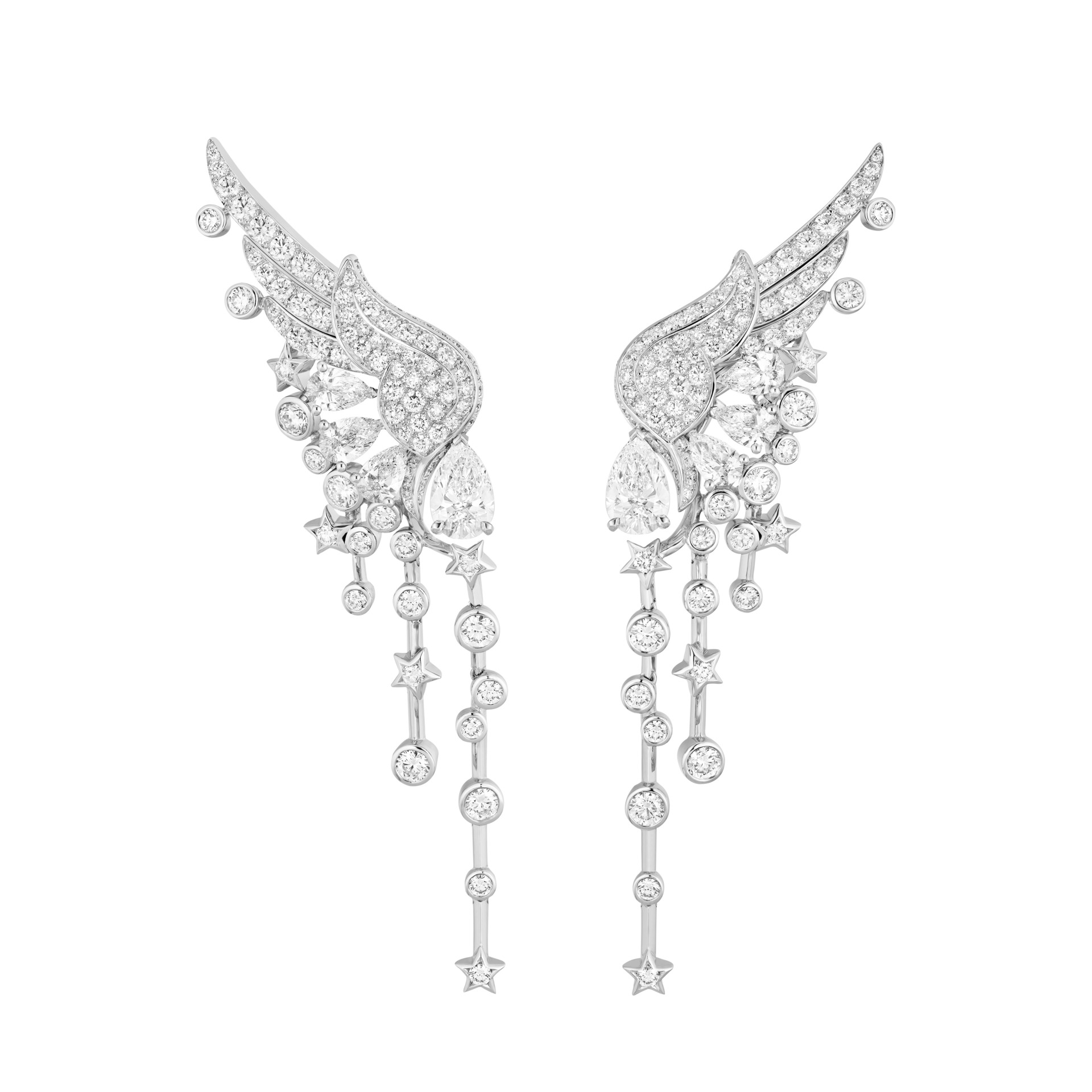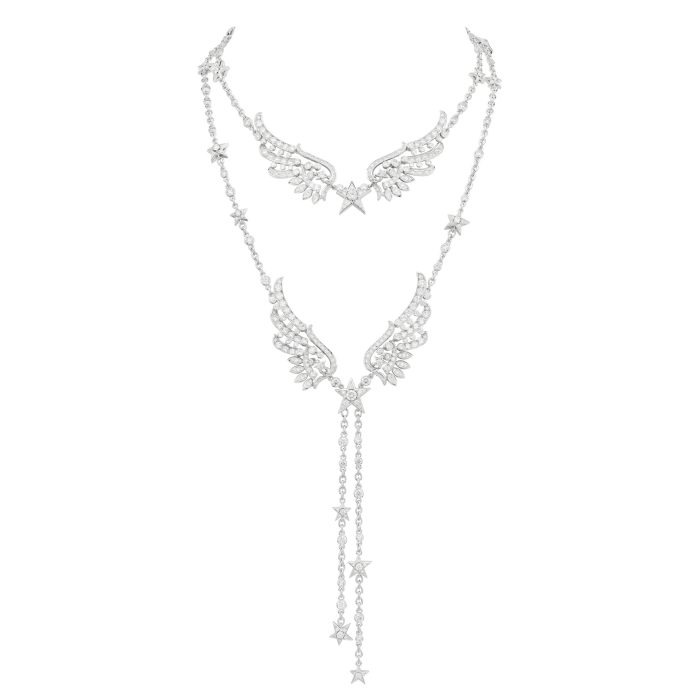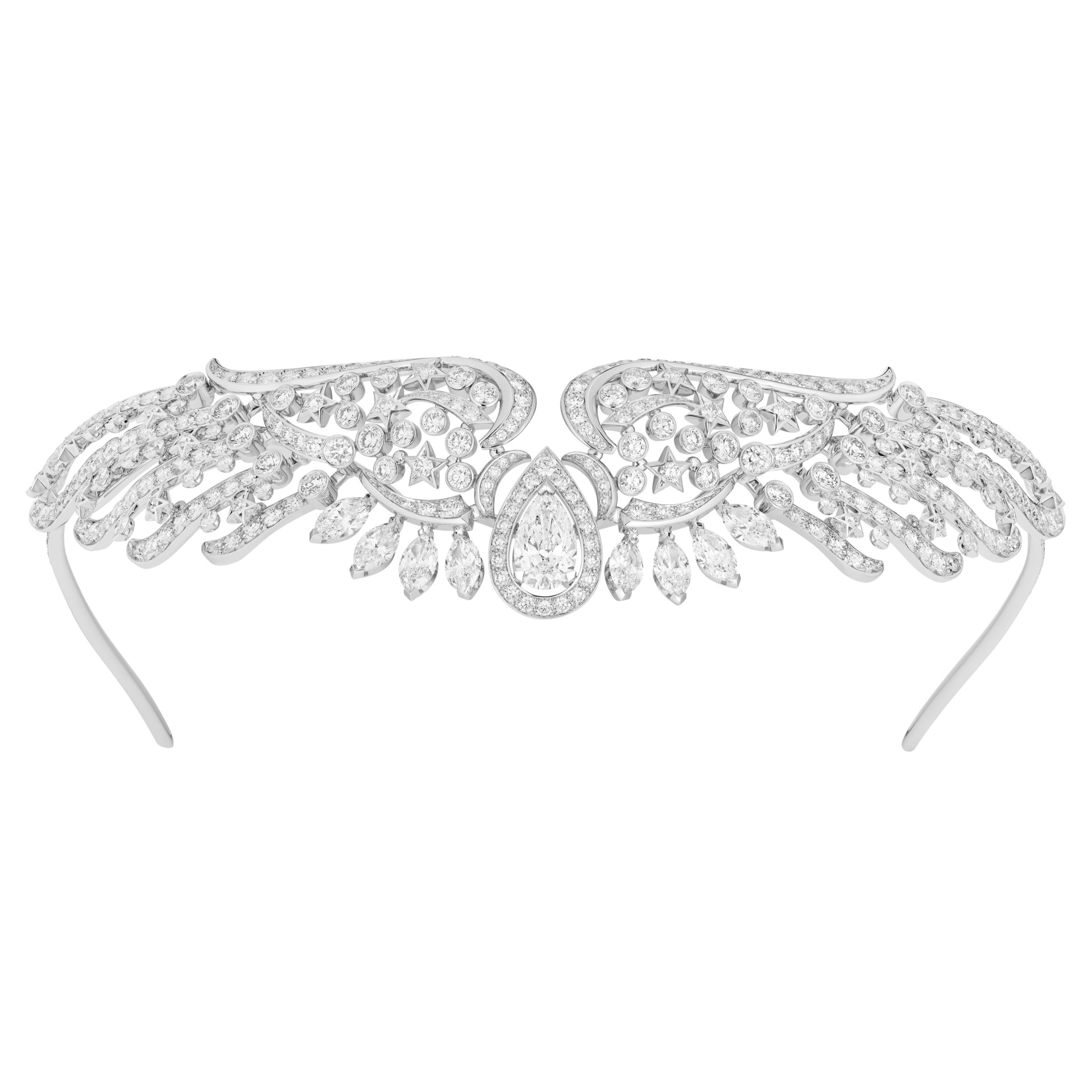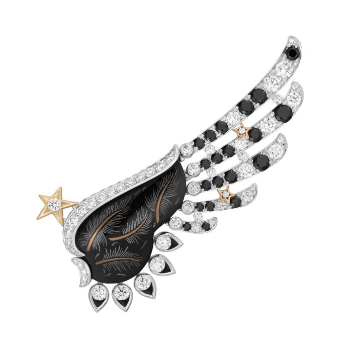Exprimant cette volonté d’accompagner courbes et mouvements, de respirer avec le corps, les ailes légères du sautoir Free Move soulignent, selon le porté, la délicatesse du dos ou celle du décolleté, les boucles d’oreilles dépareillées Pretty Wings jouent la surprise sur chaque profil, tandis que la dentelle précieuse de la tiare Full Swing encadre, à la base du front, la géométrie du visage.