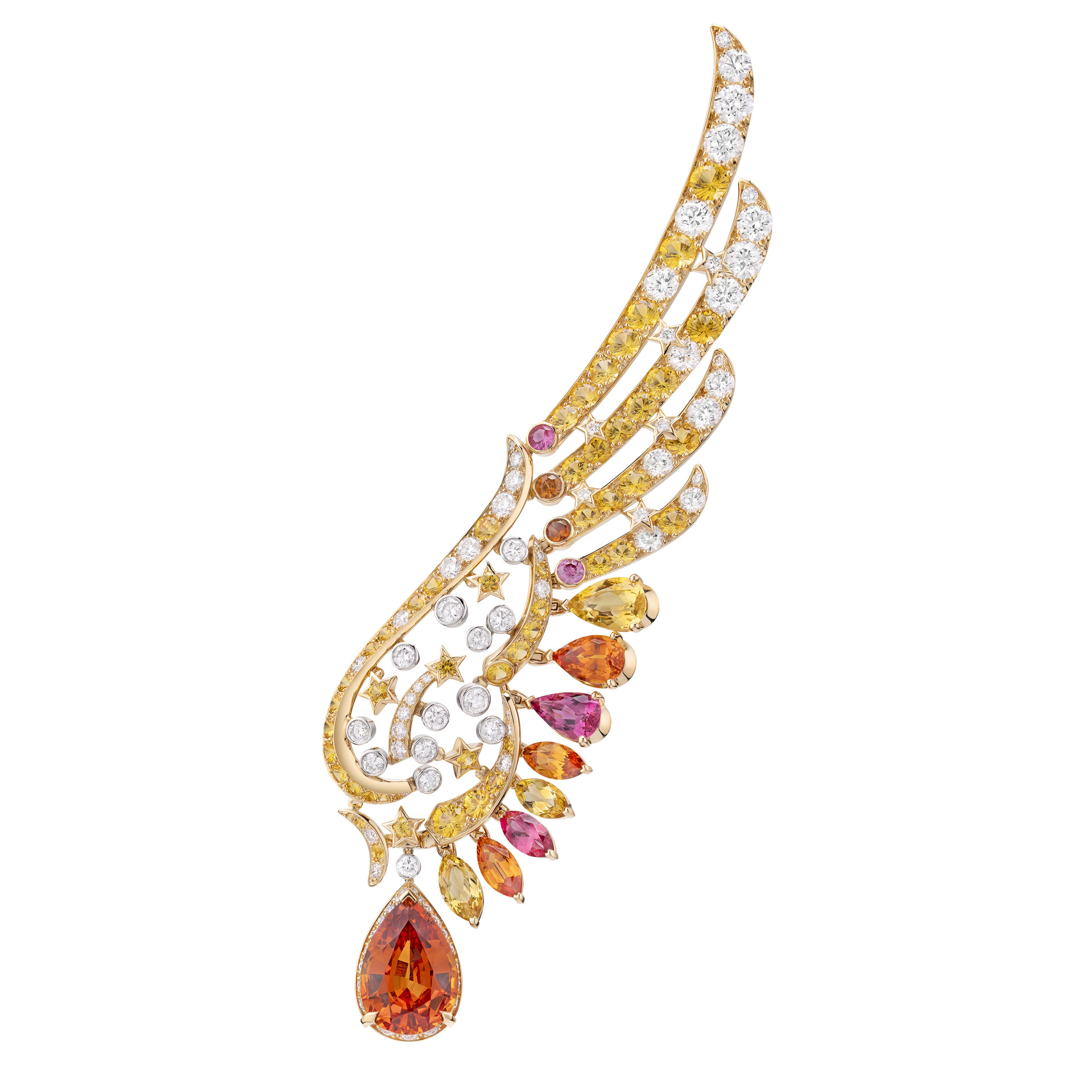 Et parce que ces bijoux ailés s’inspirent des nuances infinies des couleurs du ciel à son heure dorée et son heure crépusculaire, ils s’habillent de pierres étonnantes : des saphirs roses lumineux du collier Pink Hour aux ensembles de diamants jaune vif, cognac et orangé de la broche Sunny Days, jusqu’au subtil dégradé de bleu de la multitude de boules de tanzanite de la parure After Midnight.