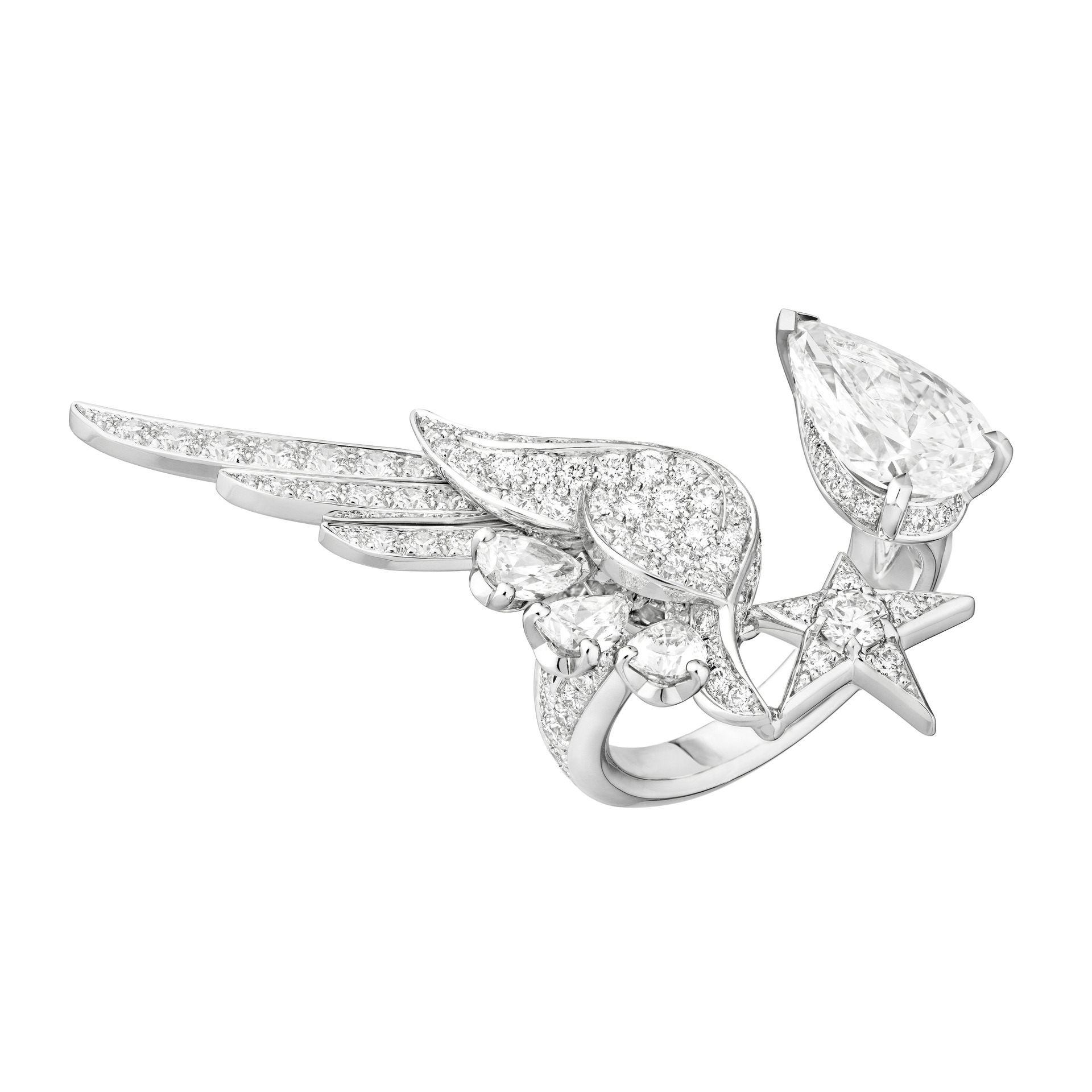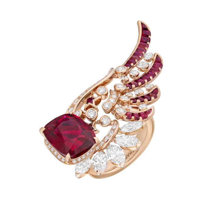 En écho à l’une des maximes de Gabrielle Chanel « Si vous êtes née sans ailes, ne faites rien pour les empêcher de pousser » (*), Patrice Leguéreau et le Studio de Création de Joaillerie de CHANEL ont interprété pour la première fois ce symbole. Travaillés sur des points d’articulation précis afin d’assurer confort, souplesse et tenue, souvent transformables, ces bijoux légers et ajourés comme de la dentelle semblent prêts à s’envoler pour se poser délicatement sur la peau et épouser les lignes du corps. À l’image du collier Wings of Chanel dont les ailes de diamant se déploient pour enlacer le cou autour d’un exceptionnel saphir Padparadscha de 19,55 carats dont la couleur est un équilibre où se mêlent avec subtilité et délicatesse, des nuances de rose et d’orange. Elles terminent leur course précieuse sur un long pendant détachable pouvant se porter aussi en bracelet. De même, la bague de cette parure, ornée d’un diamant ovale de 8,15 carats DFL, dessine une aile qui semble à peine posée sur la main.