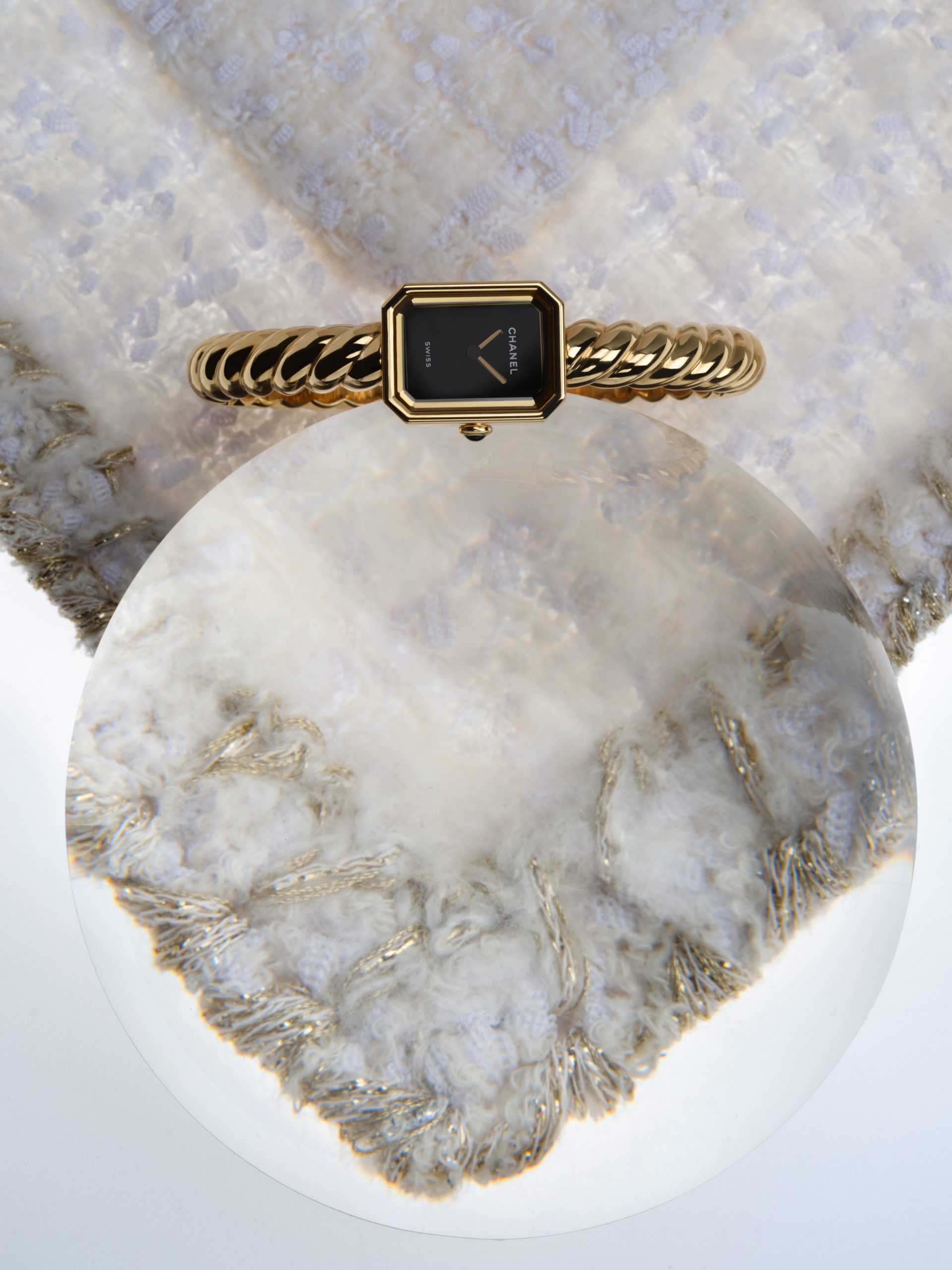 On retrouve, dans cette déclinaison, ce qui fait la force de la Première depuis son origine : la netteté d’un contour, la sobriété d’un cadran, la cohérence d’un bracelet qui dit la Maison avant de dire l’heure. En remplaçant la chaîne entrelacée de cuir par un galon travaillé dans le métal, CHANEL ne multiplie pas les références ; la Maison concentre son propos. La bordure, devenue volume, suffit à dessiner la montre. Ce passage du textile à l’or n’a rien d’un effet de style : c’est une traduction fidèle d’un code actif de l’atelier, une manière de rappeler que l’horlogerie CHANEL s’écrit avec les mêmes mots que ses tailleurs.