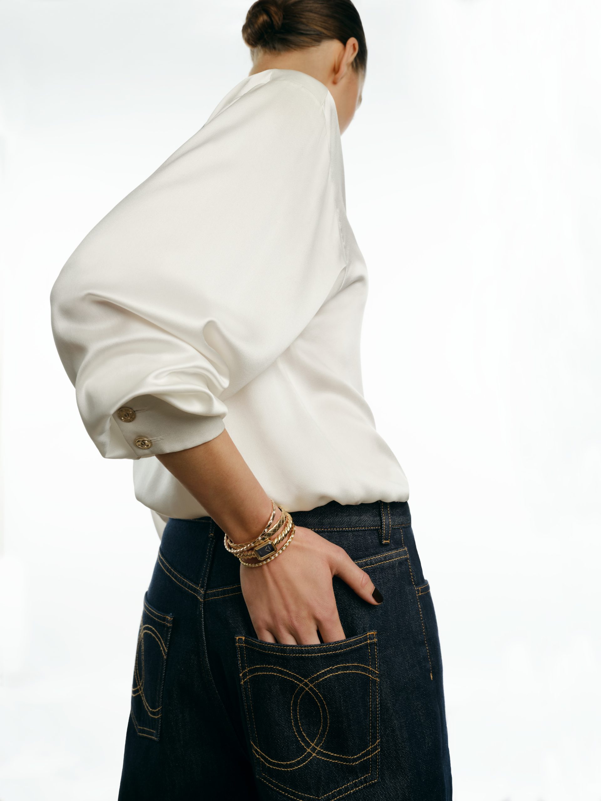 La montre Première Galon gagne à être portée dans des environnements calmes, où sa voix peut se faire entendre sans effort. Sur un tweed clair, l’or prend une patine douce et fait vibrer la texture. Sur une chemise blanche, la surface noire s’impose comme un point d’encre à la jointure de la manche et de la main. Avec une maille fine, col rond ou col roulé, la montre se porte au contact : pas d’empilement ni de volumes adjacents qui brouilleraient la lecture du galon. La version sertie appelle le même recul ; un écho discret, une bague à l’onyx ou un solitaire suffisent. La version pavée prend naturellement le premier rôle : c’est alors le bracelet qui raconte, et c’est tout ce qu’il faut.