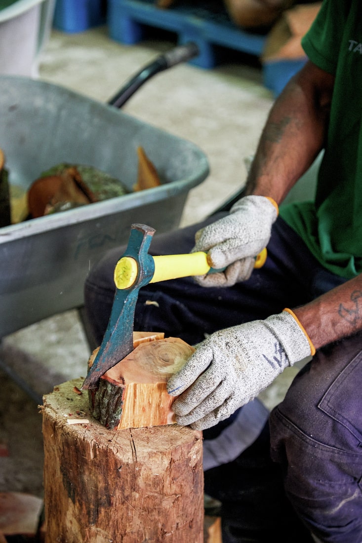Le prélèvement n’est jamais massif. Il est ciblé, accompagné, ritualisé. Ce n’est pas un abattage : c’est une sélection. TAKONE, la structure kanak en charge de l’exploitation, procède ensuite à une coupe douce, dans le respect de l’arbre et de la biodiversité. Rien n’est mécanisé. Le bois est débité à la main, transporté à dos d’âne — un clin d’œil aux pratiques ancestrales, mais aussi un choix écologique.