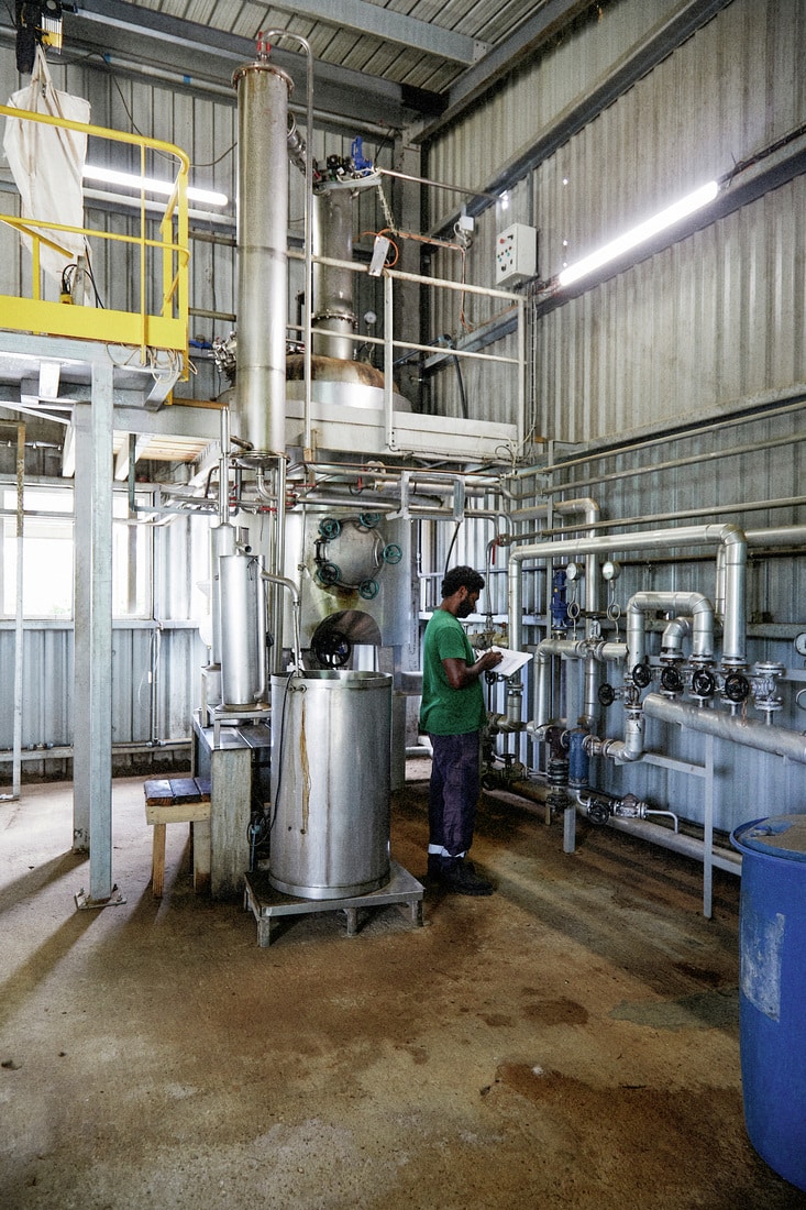 L’usine de transformation est située sur l’île. Elle est dirigée par SEREI NO NENGONE (SNN), structure locale cofondée avec Jean Waikedre et ROBERTET, partenaire de longue date de CHANEL. Le bois de cœur est broyé, transformé en poudre, puis distillé selon un procédé exclusif. Ce contrôle intégral garantit une traçabilité parfaite. On sait précisément quel arbre a donné naissance à quel extrait. Une exception dans l’industrie.