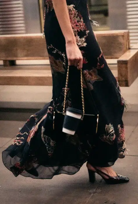 La robe bouffante surgit comme une apparition. Elle crée un contraste immédiat : du volume et du souffle dans un lieu dur, étroit, utilitaire. Et pourtant, cela fonctionne. Parce que New York accepte ce choc. Parce que le métro, précisément, mélange le quotidien et le fantasme. Cette robe rappelle que CHANEL sait produire du rêve, mais sans quitter la ville.