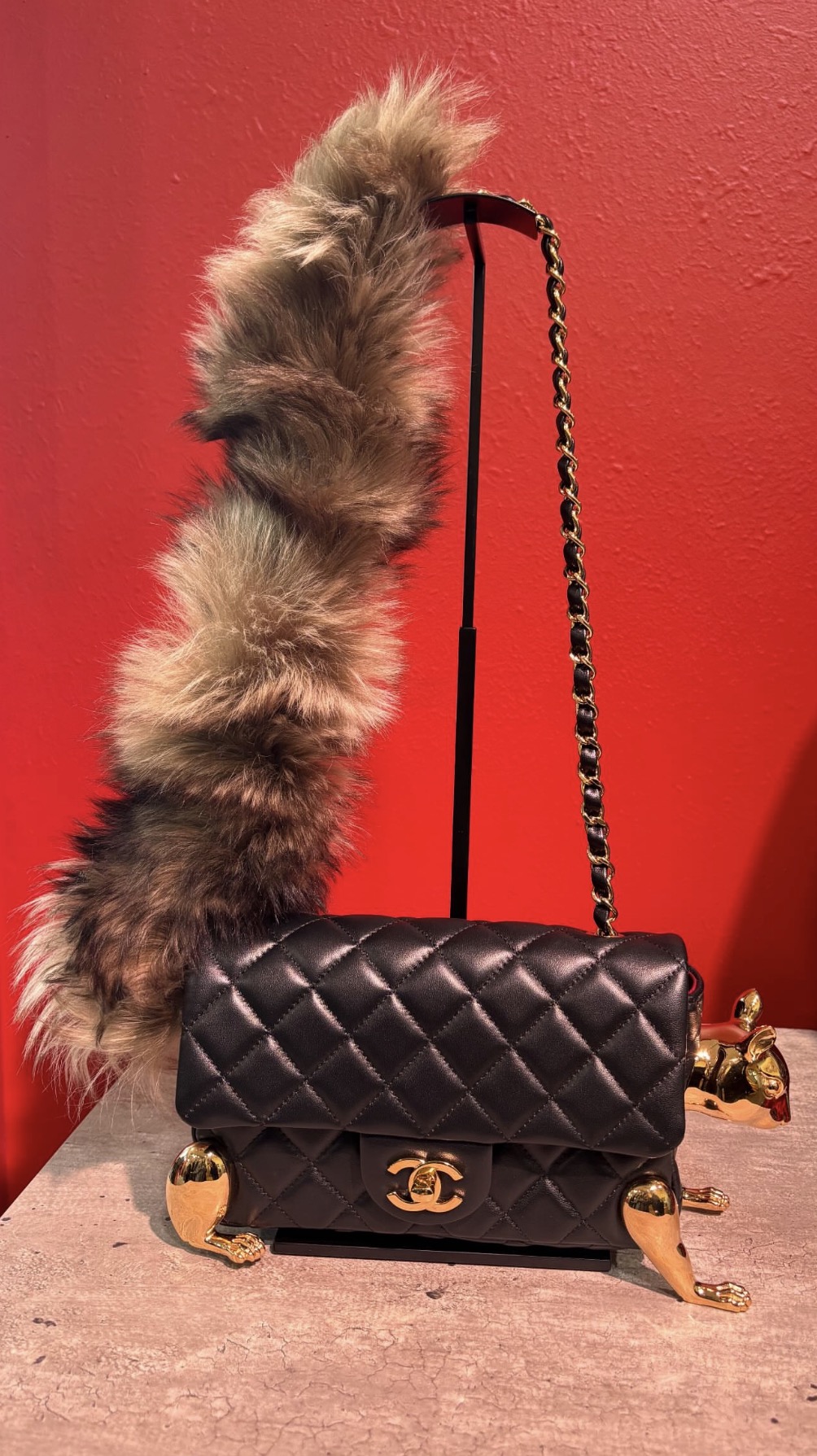 Les imprimés animaliers irriguent la collection. Léopard. Girafe. Variations multiples. New York est traitée comme jungle urbaine. Et l’animal devient parfois accessoire : un sac matelassé peut se transformer en girafe dorée. D’autres pièces poussent la fantaisie plus loin, jusqu’au bestiaire assumé, dont l’écureuil.