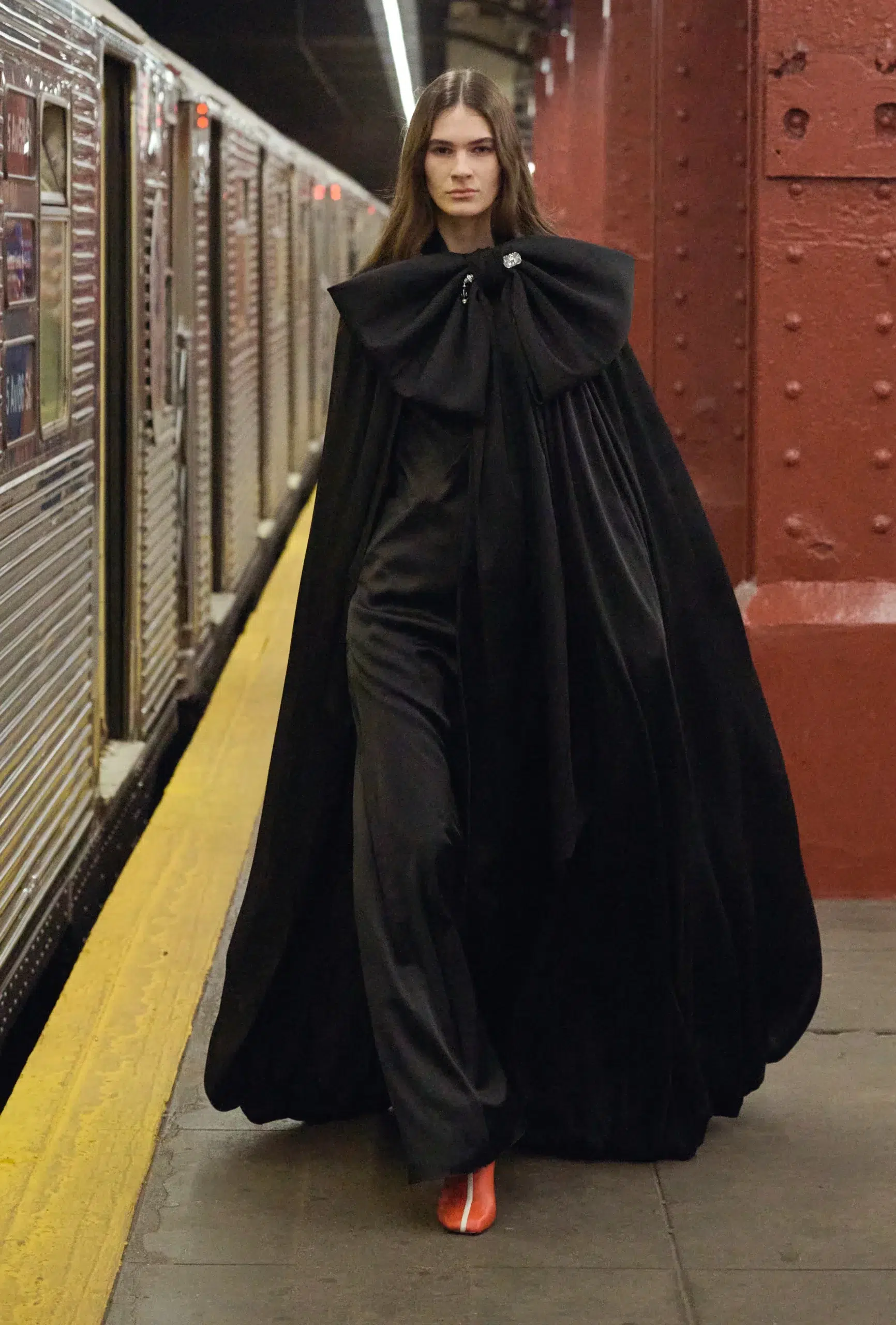 Une silhouette drapée d’une immense cape noire traverse le quai comme si elle revenait d’une première. Elle est souveraine, mais elle est là, au milieu des autres. C’est une image très forte du défilé : le grand soir n’est pas exclu du réel. Il le traverse.
